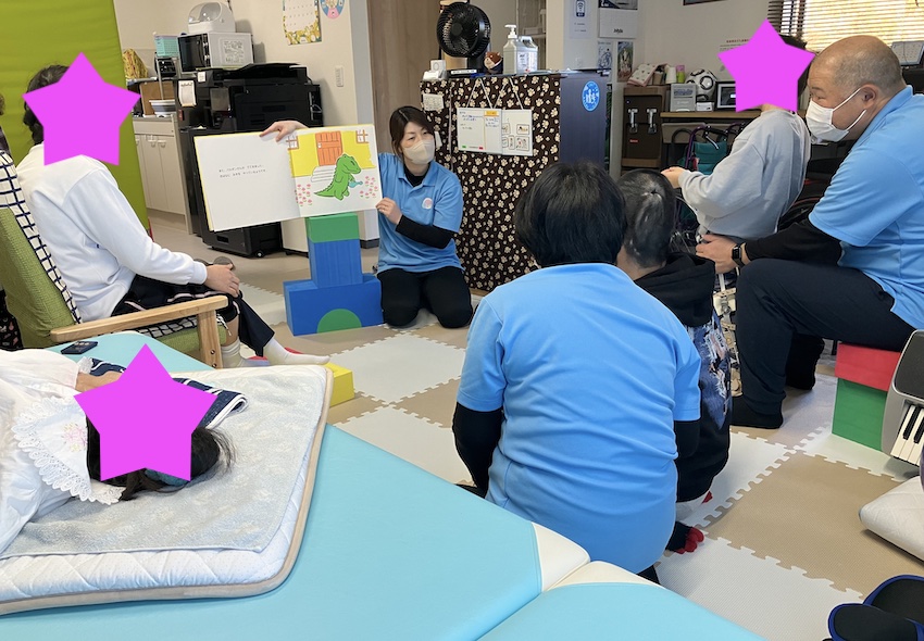 散歩をしてひと段落したところで、保育士による読み聞かせを行いました。「バルボンさんのおでかけ」という大判の絵本です。ウェルスマイルでは掛川市立図書館にお願いをして、絵本を毎月20冊程度借りています。毎月保育士が図書館に赴き、季節の絵本や皆で一緒に見ることの出来る大きな絵本を選定してくれます。