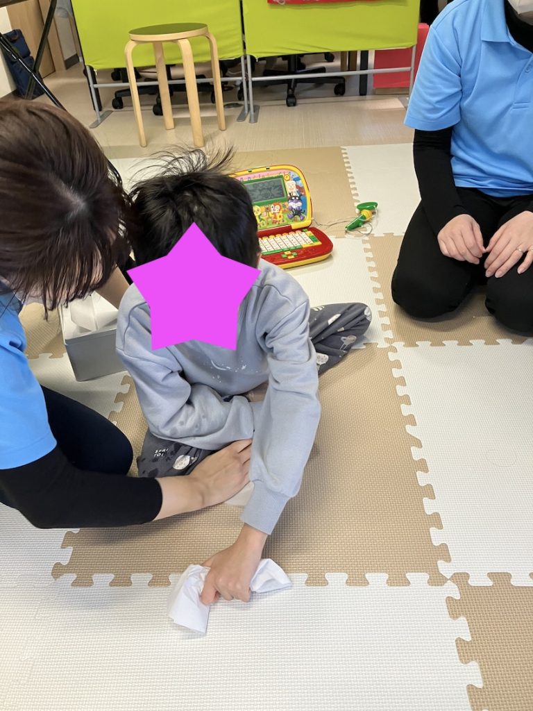 支援中に水分補給をしています。水分補給をしている最中にこぼれたお茶を拭いていたところ、「手伝って」と声をかけていないのに写真のお子様がお茶を拭き取るのを手伝ってくれました。周りの状況を把握して適切な対処ができることはとても素晴らしいです。