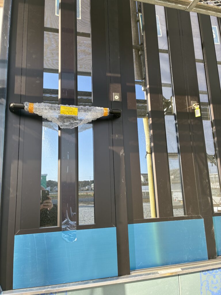 入り口のドアです。掛川と同様に3枚ドアでバギーや車椅子でも入りやすい様に、広く開く様なドアにして頂きました。ドアノブが横になりグレードアップしました。