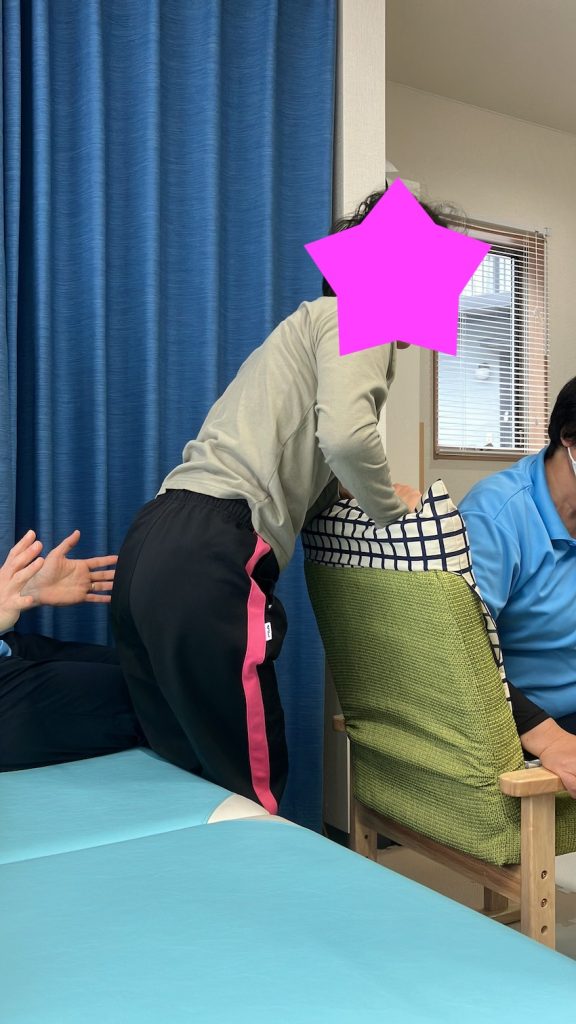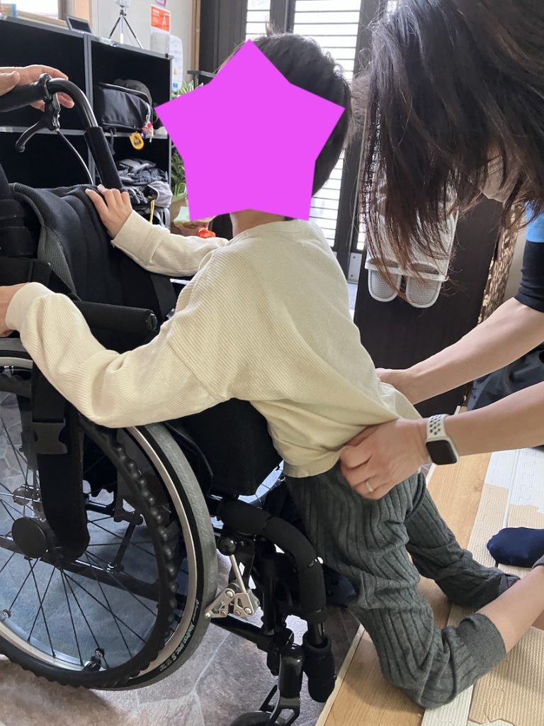 最近車椅子を作製したお子様です。車椅子操作が少しずつですが上手になってきました。今日はブレーキ操作が自分でできる様になり、一人でできることが多くなってきました。その中で、車椅子に一人で乗ることを練習しています。写真はその様子です。両膝立ちになる事は介助で可能です。ここから膝を伸ばすことを練習していきます。一人で乗れて操作できる様になると生活の幅も広がります。