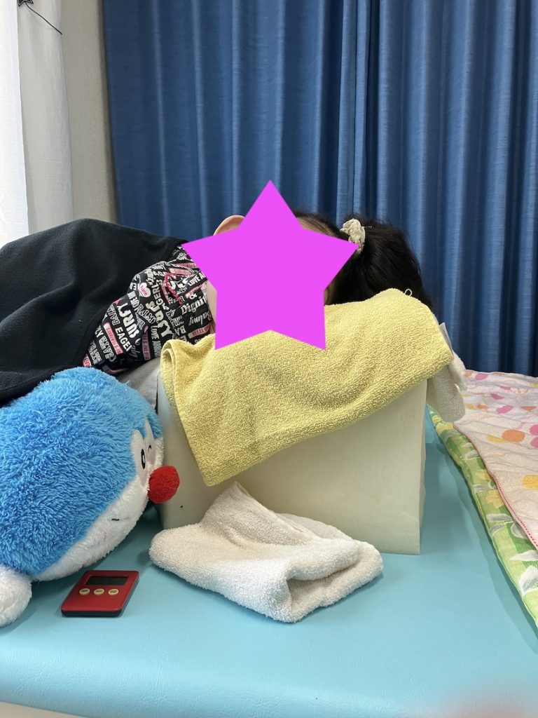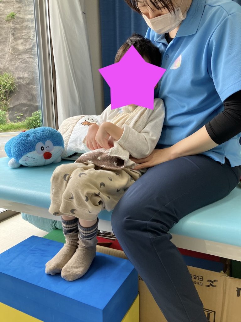 うつ伏せを行いました。表情をお見せできないのが非常に残念ですが、今日の支援中は笑顔が絶えませんでした。隣に仲の良いお友達いたのも理由の一つだと思います。