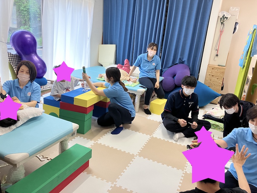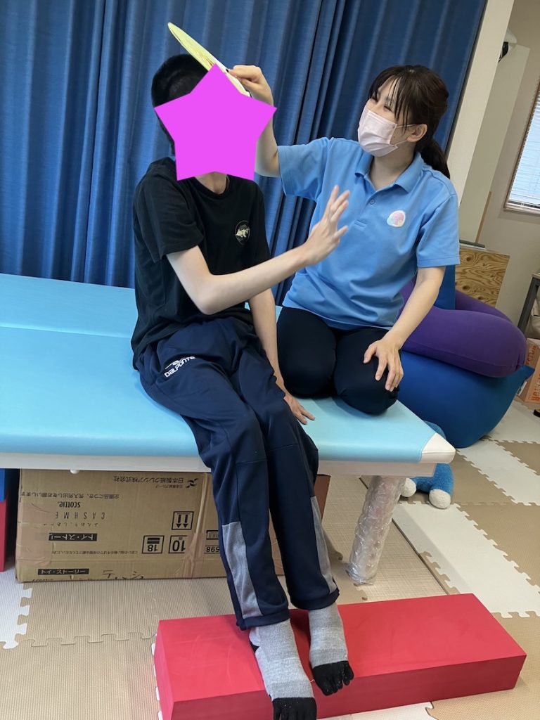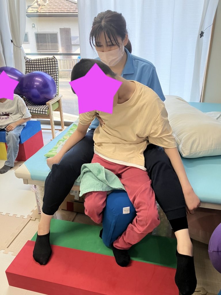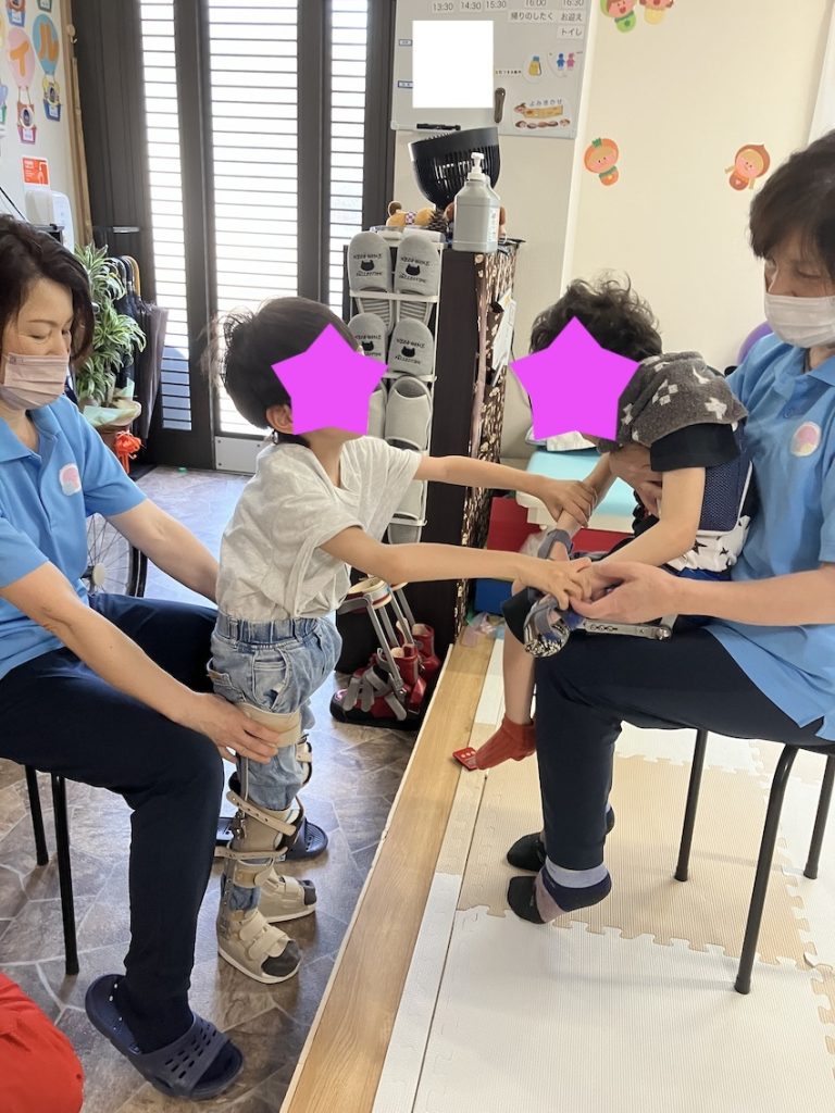 立っているお子様は立ちながら前方への体重移動、座っているお子様は顔を上げて姿勢をよくすることを狙っています。視点を変えながらお互いの顔を見る事で相乗効果が生まれています。立位や座位は寝ている時と比べて刺激が入りやすいです。お二人とも楽しそうな顔をしていました。