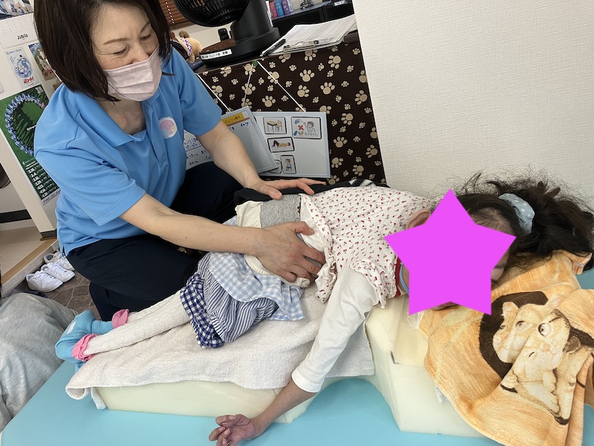 個別療育の様子です。ストレッチや座位をおこなっています。病院の外来リハビリと違って遊びを通して療育を行っています。単純に遊びで関わるだけではなく、姿勢を作って職員との関わりを増やしたりつまみの遊びをする等工夫しながら行っています。