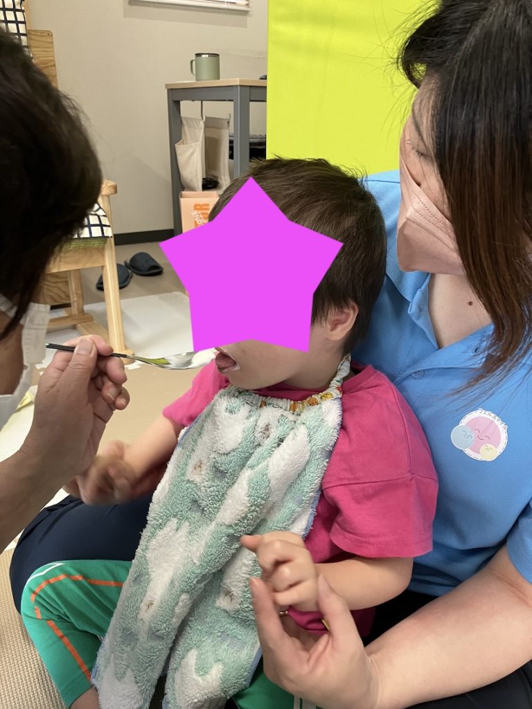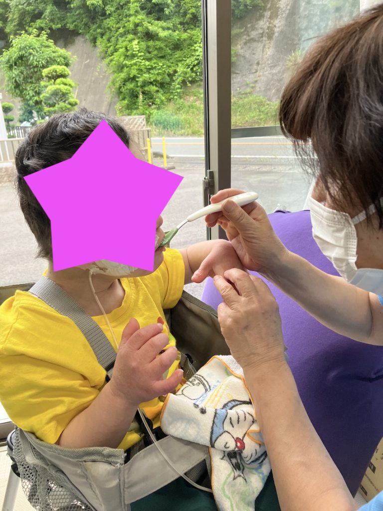 言語聴覚士にアドバイスをもらいながら実施しています。その中で最近少しずつ変化が見られるお子様もいます。具体的にはスプーンでとろみのついたお茶を飲んでいる時に、舌を前後に出す行為に加えて、スプーンを噛む行為が出てきました。学校やご自宅でも口から食べる量が増えてきたとの事で、とても良い傾向です。このような小さな変化を見逃さない様にして、支援に繋げていきたいです。