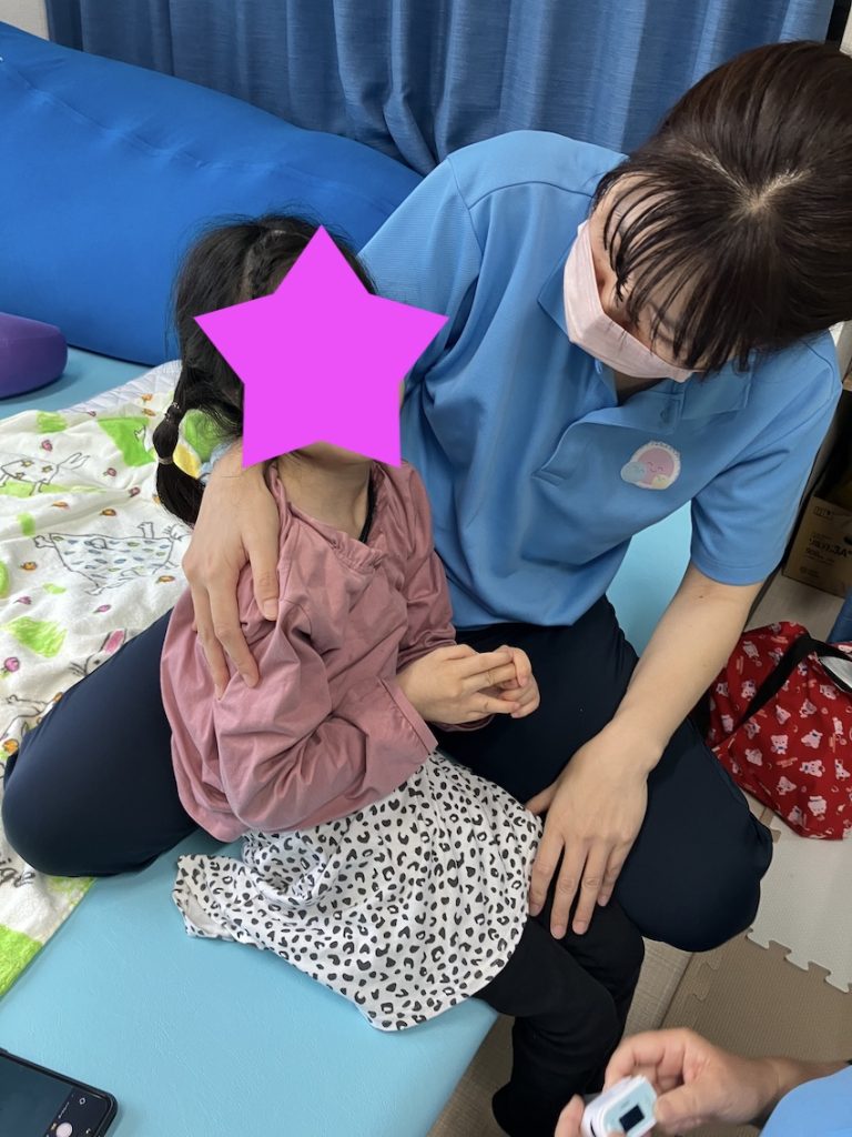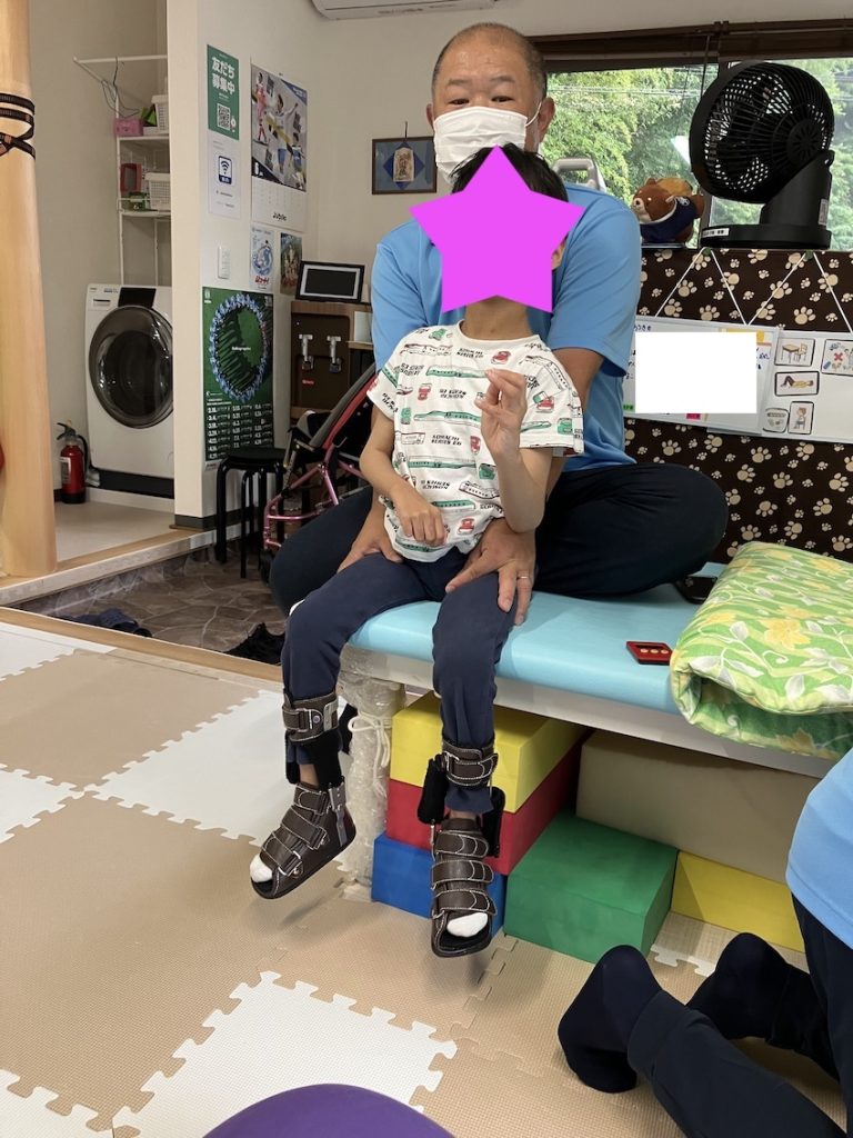 ベッドに座っているお子様ですが、骨盤の安定性が増してきました。わざと足を浮かせて座ってみましたが、骨盤で体重を支えて体幹を安定的にコントロールしていました。これからは立位に繋げていきたいです。
