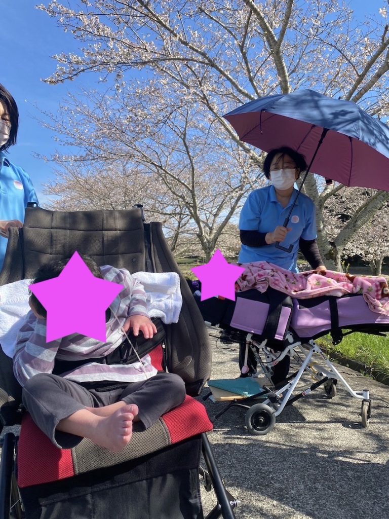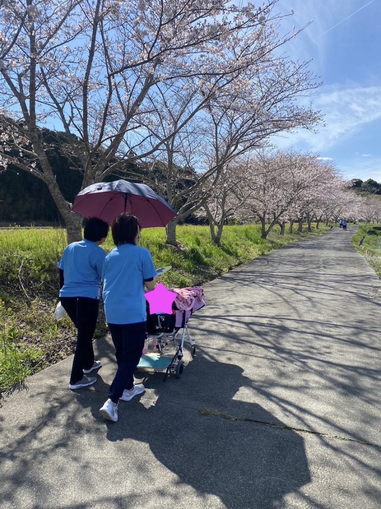 利用中の保護者様に紹介していただいた場所に行ってきました。この暖かさで桜が一気に開花した感じでした。子供達は直射日光で熱がこもりやすいので、雨傘を日傘がわりにして日陰を作って散歩しました。短い時間でしたが良い経験ができたと思います。