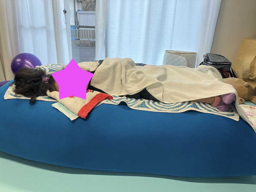 散歩に行った後、少し休んでから個別の療育を行いました。写真は普段ベッドで仰向けで寝ているのをYogiboで仰向けに寝てみたものです。Yogiboの特徴としては、形状を変えられることで体圧を分散できる事です。これは床ずれ防止には必須です。