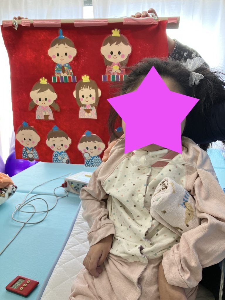 ウェルスマイルを利用してくれているお子様の男女比は3:1で男の子が多いです。ひな祭りは過ぎてしまいましたが、今日久しぶりにご利用頂いた女の子と記念撮影をしました。ベッドで座位をとっている時間を見計らってお雛様を用意しました。写真でお見せできないのが残念ですが、目がパッチリ開いて可愛い写真が撮れました。その後休みながら呼吸訓練を行いました。肩周囲の呼吸補助筋をストレッチすると、呼吸が安定します。