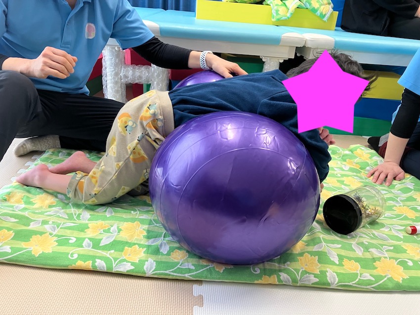 最後に紹介するのはピーナッツ型バランスボールです。学校にも同様のものがあります。通常のバランスボールは球状ですが、四つ這いの練習をするのには写真のようなピーナッツ型が最適です。お子様の体格に合わせて、小さめのものを購入しました。これで膝や手に体重をかける練習をしています。