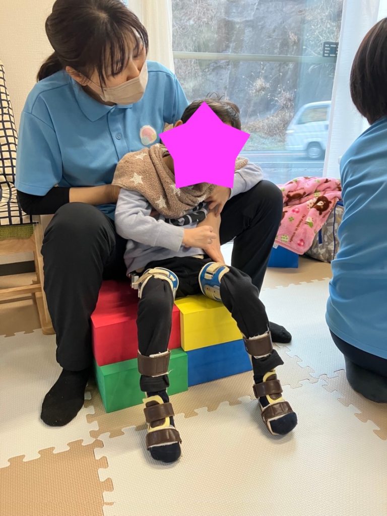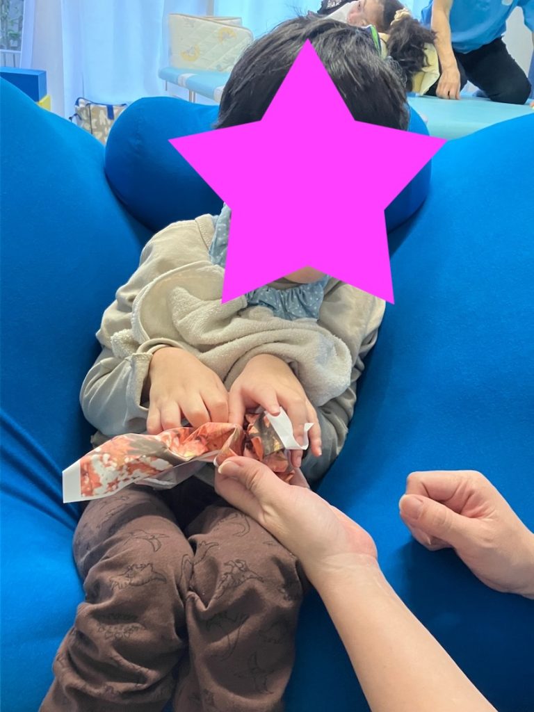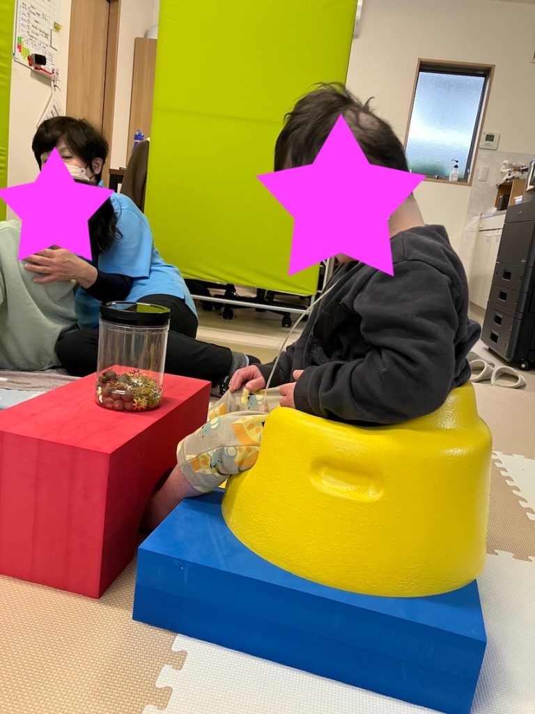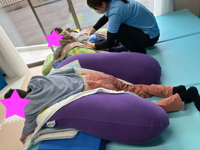 続いてはYogiboです。うつ伏せや座位を取るのに大変重宝します。Yogiboは形を変えられる事が最大の特徴です。大きさは様々ありますが、その子の体格に合わせて変えられるのが良いです。また他のクッションとの組み合わせでいろいろな姿勢に対応できるのが良いです。Yogiboのキャッチフレーズは「人をダメにするクッション」ですが、療育で使用すると「可能性が無限大」のクッションです。