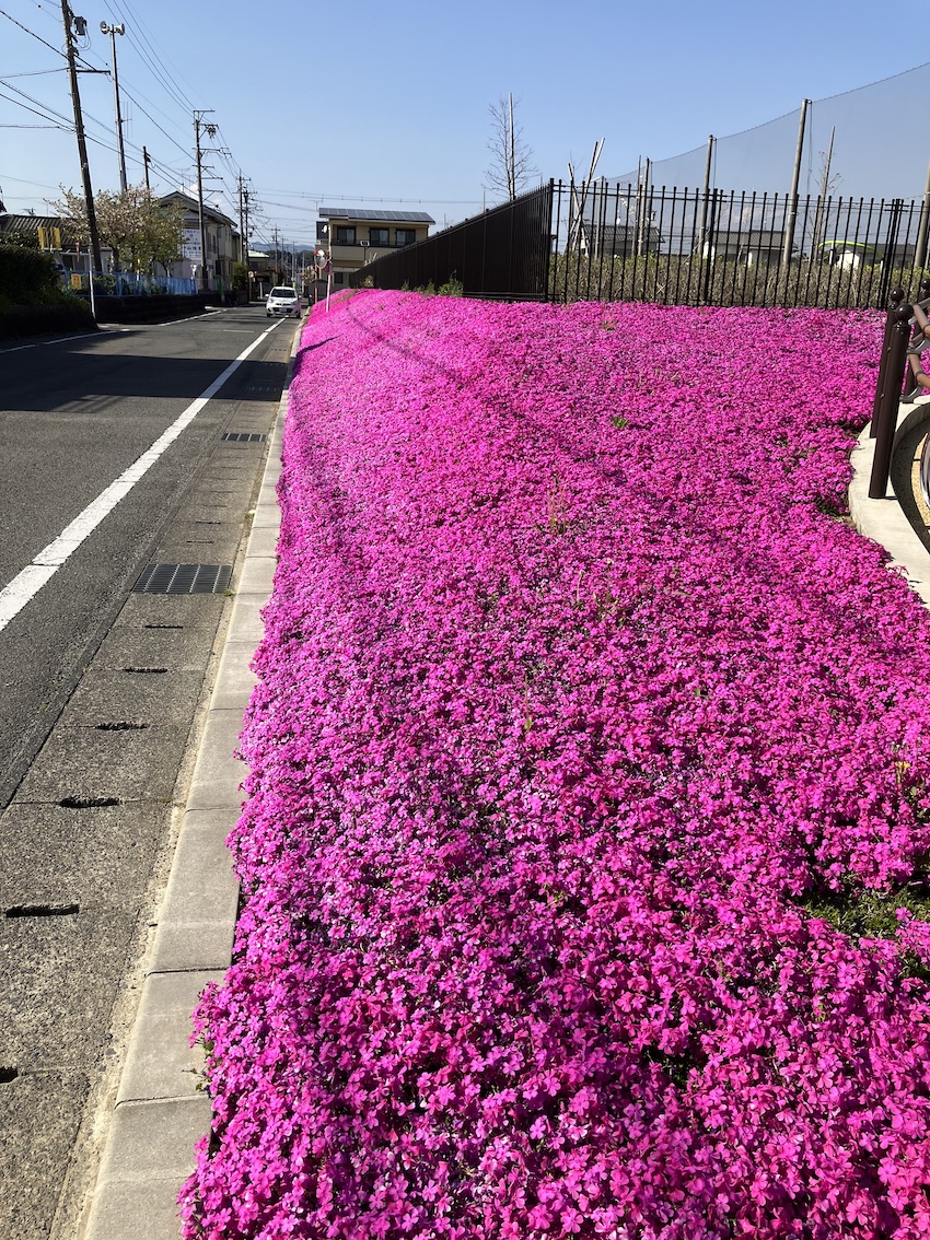 掛川市下垂木にあるゆうゆうパークに行ってきました。2年ほど前にサッカー場の周りを公園と遊歩道にして、散歩や遊べる環境になっています。ゆうゆうパークの西面には写真の通りの芝桜が一面に咲いています。遠くから見てもとても綺麗で、皆で見にいきました。