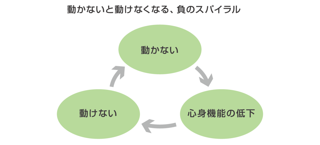 心肺機能が低下すると、以前と比べて「動けなく」なります。以前と比べて動けなくなると、動かない時間が増えます。