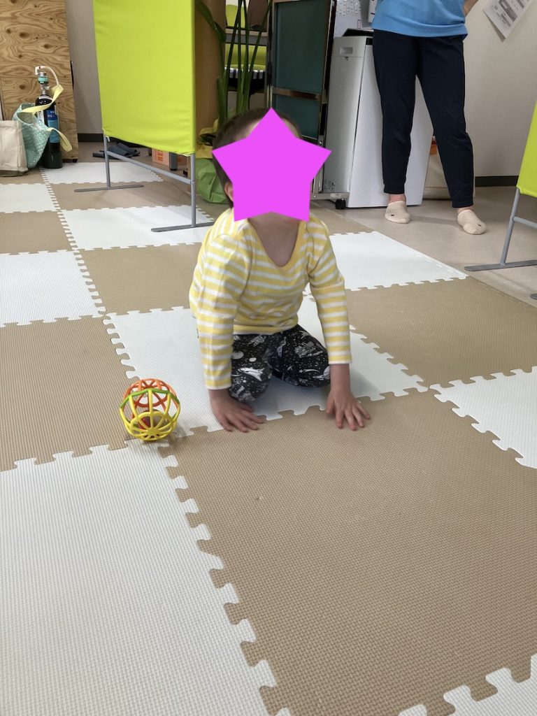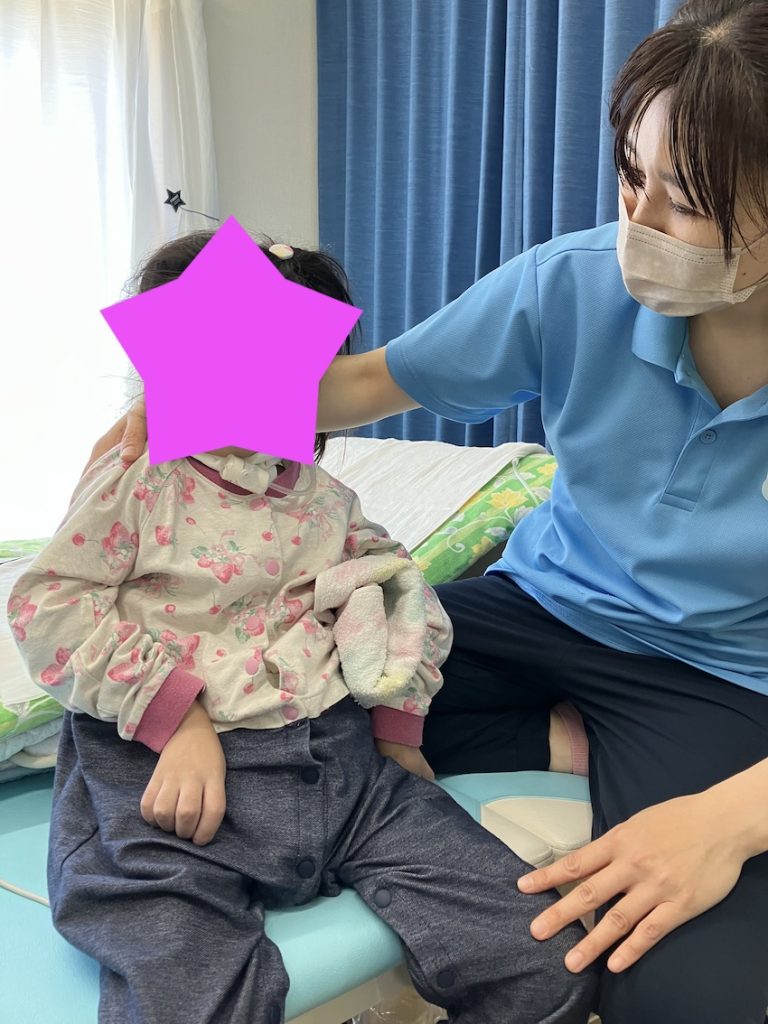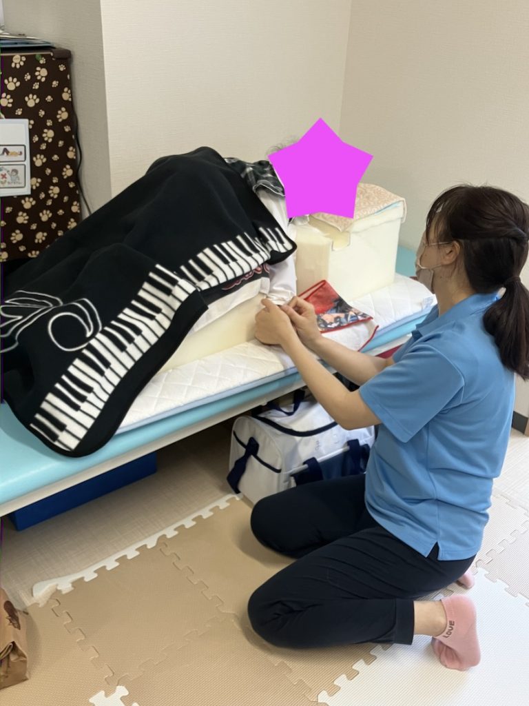 注入前に関節を動かして座位をとりました。調子が良い様子で、たくさんの笑顔も見られました。重力に抗する姿勢を無理のない範囲で取っていきたいです。