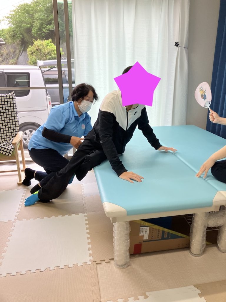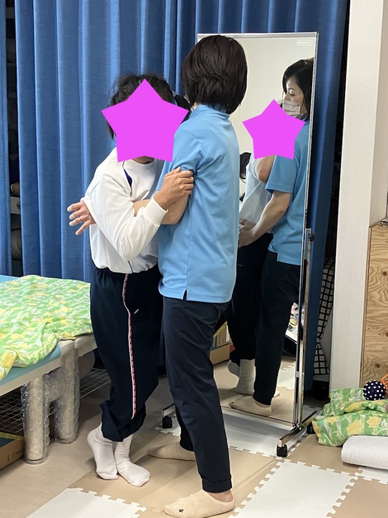 最近ベッドに乗る様になりました。ベッドで足を伸ばしたり、足を垂らして座るなど膝を伸ばす機会も増えてきています。たくさんの姿勢をとる事が重要ですので、ベッドに乗ることや座ることなどを積極的に行っていきたいです。また、物を投げる事が少なくなってきました。ウェルスマイルでは卒業後の進路も視野に入れながら療育を行っています。高校卒業後に通う施設の職員とも情報共有を行いながら、スムーズな移行や切れ目のないサービスが展開できるように支援していきたいです。