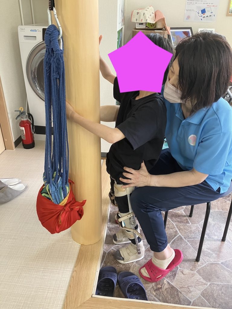 装具をつけて立つ練習をしています。病院の外来リハでは、後ろに持たれない様にしているとの事でしたので、ウェルスマイルでも前方への荷重を意識して行っています。骨盤の後傾が立位姿勢に大きく影響しています。股関節の硬さが結果的に骨盤の動きを制限しています。背もたれ無しの椅子座位をとることで、股関節の筋緊張が緩んできます。その後立位をとると立位の姿勢がよくなります。ウェルスマイルにいる時間は床でのあぐら座位の時間を少なくしていきたいです。