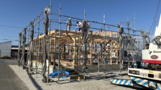 1/13に磐田事業所の上棟が行われました。 本日、屋根の下地まで乗せるそうです。来週中に壁が出来るとのことです。安全に作業が進む様に願っています。 今後も定期的に報告します。